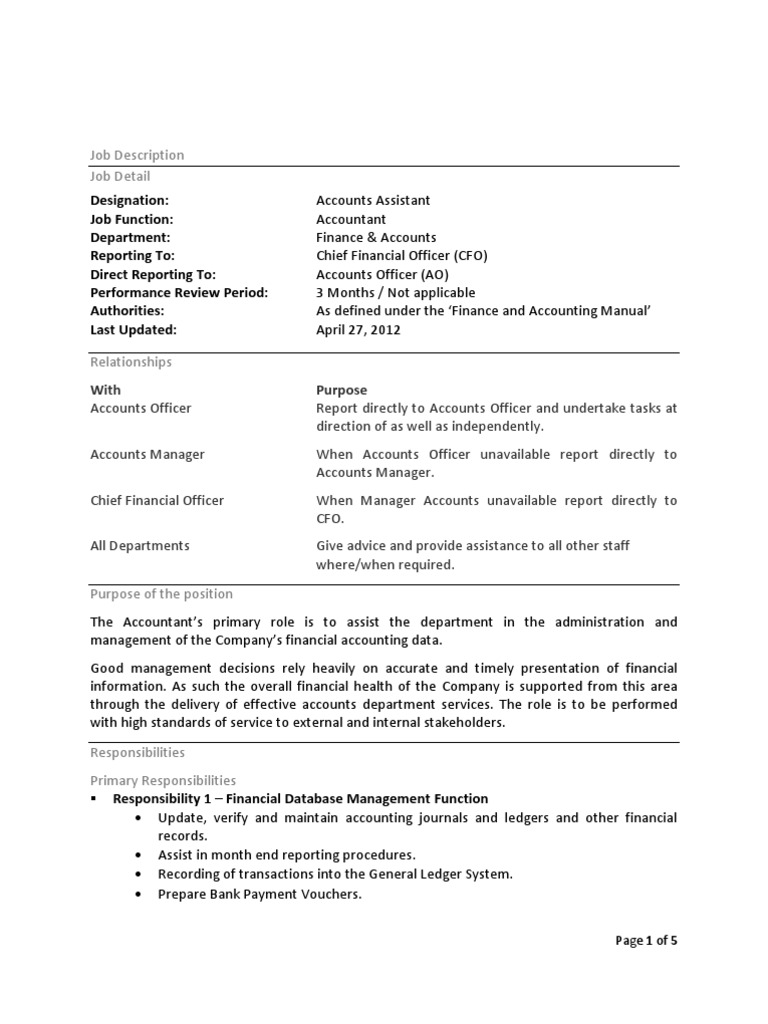 (6 days ago) a chief financial officer (cfo) is the senior executive in an organization managing the financial actions of a company. The senior accounts officer will, under the direction of the finance manager, provide essential financial reporting and accounting / clerical services to the institute, and assist with backing up the finance manager role in times of absence or illness. Financial officer job description template: Band 6 af= application form i= interview t= test person specification essential desirable method of assessment experience 1.1 relevant experience of working in a financial related area. The cfo is a member of the executive committee and acts as business partner to the ceo and other senior leaders, and supports development of the business' overall strategic plan.